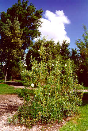 Arbusto que puede alcanzar los 2,5 mts. Hojas agrupadas por pares a ambos lados de los nudos (opuestas). Son enteras, alargadas y estrechas.