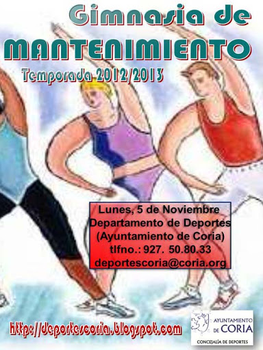 La Concejalía de Deportes del Ayuntamiento de Coria informa sobre el inicio de las Escuelas de GIMNASIA DE MANTENIMIENTO y de la Escuela MULTIDEPORTIVA, que el próximo LUNES 5 DE NOVIEMBRE comenzarán las clases en los diferentes horarios y lugares establecidos en el momento de formalizar la inscripción.