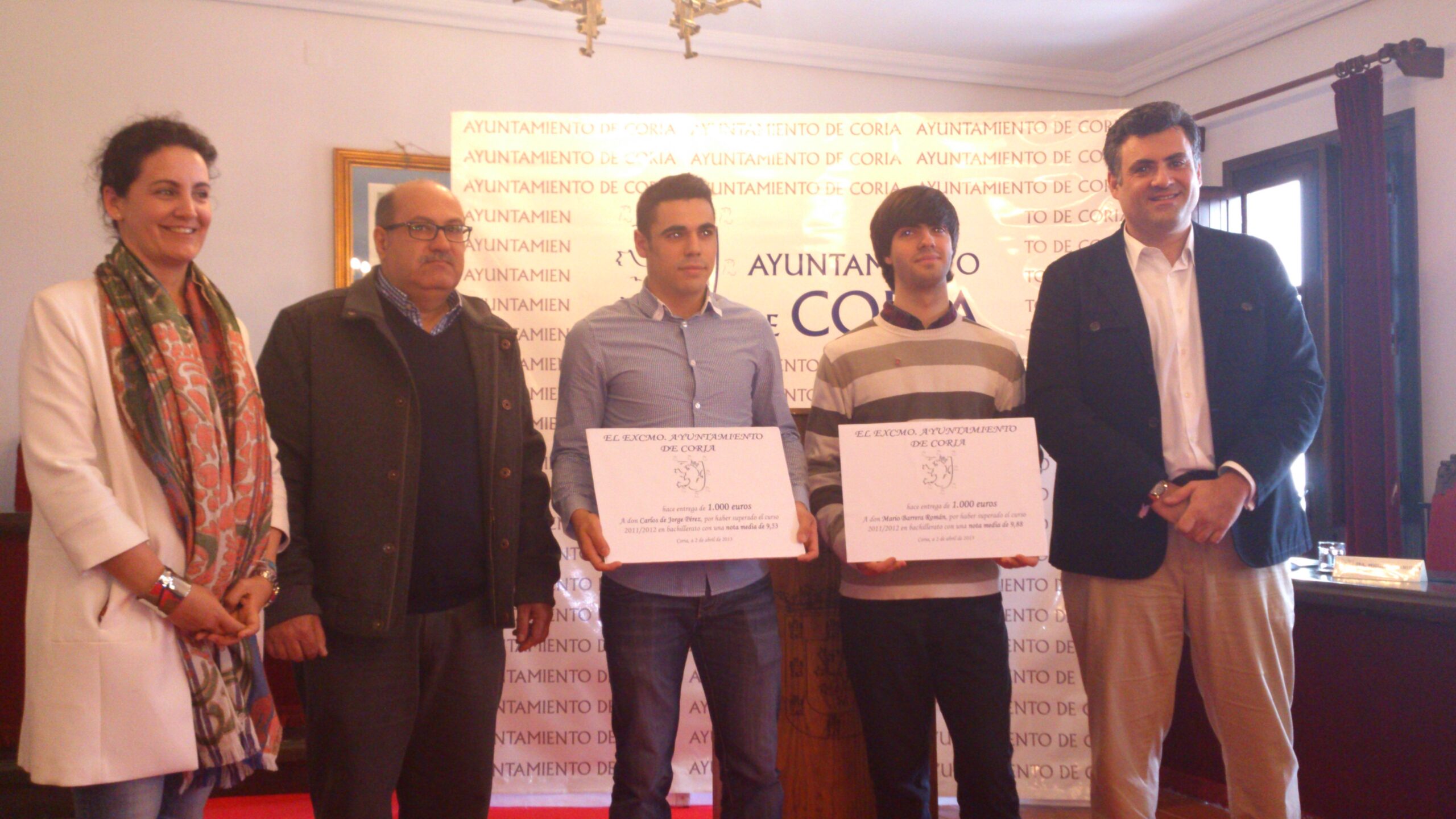Esta mañana, en el Salón de Plenos del Excmo. Ayuntamiento de Coria, el Alcalde-Presidente, José Manuel García Ballestero ha hecho entrega de dos becas a los mejores expedientes académicos del curso 2011/2012 en bachillerato del IES Alagón.