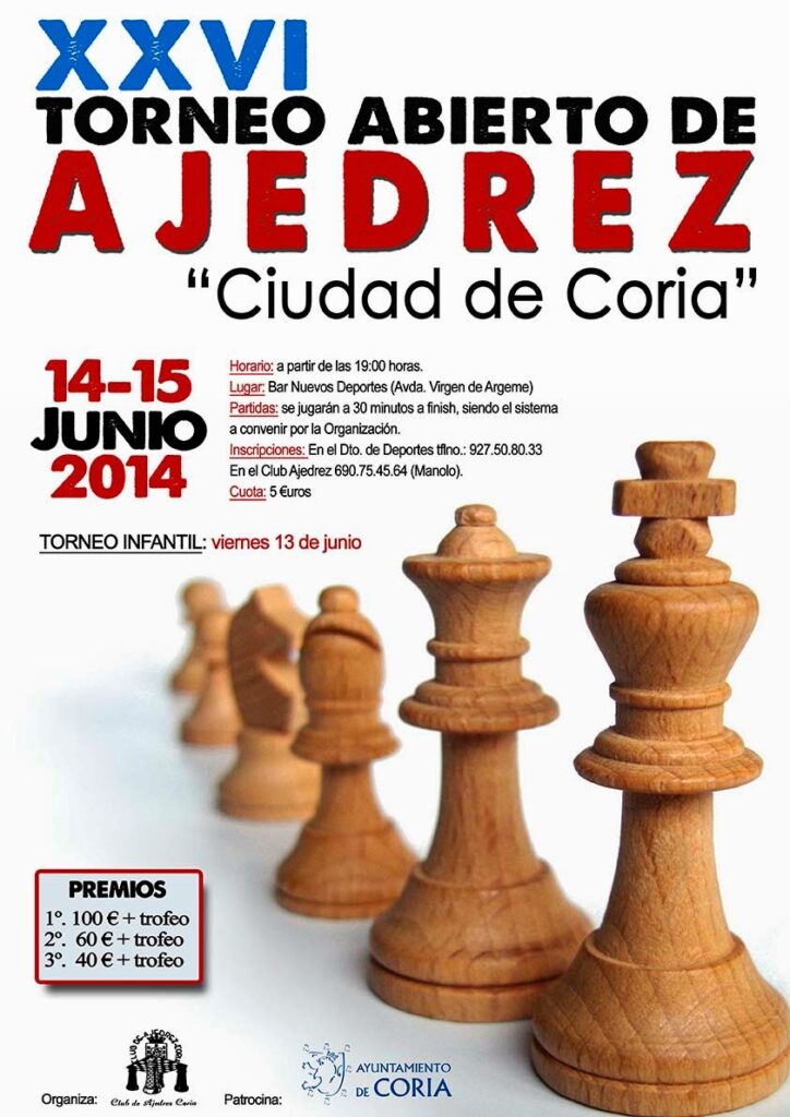 El Club Ajedrez Coria bajo el patrocinio de la Concejalía de Deportes del Ayuntamiento de Coria, presenta el XXVI TORNEO ABIERTO DE AJEDREZ «CIUDAD DE CORIA», que se celebrará durante los días 14 y 15 de junio.