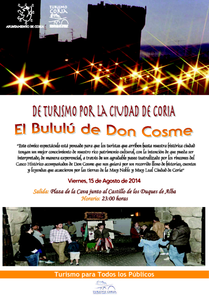 Este cómico espectáculo está pensado para que los turistas que arriben hasta nuestra histórica ciudad tengan un mejor conocimiento de nuestro rico patrimonio cultural, con la intención de que pueda ser interpretado, de manera experencial, a través de un agradable paseo teatralizado por los rincones del Casco Histórico acompañados de Don Cosme que nos guiará por un recorrido lleno de historias, cuentos y leyendas que acaecieron por las tierras de la Muy Noble y Muy Leal Ciudad de Coria.