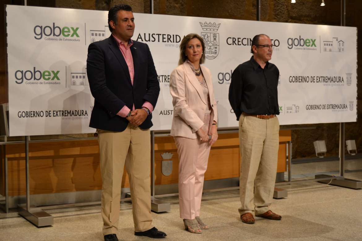 La consejera de Educación y Cultura, Trinidad Nogales, presentó los actos programados con motivo del XVIII Festival Internacional de Guitarra Ciudad de Coria 2014, que se desarrollarán del 2 al 9 de agosto, acompañada por el Alcalde de Coria, José Manuel García Ballestero, y el director del Festival, Hugo Geller