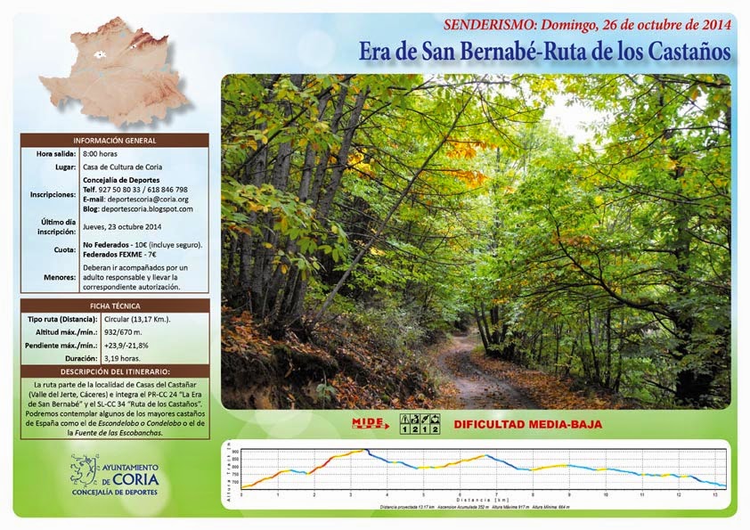 El Departamento de Deportes de la Concejalía de Deportes, después del parón veraniego, pone en marcha la nueva ruta senderista de la temporada 2014, con la ruta «ERA DE SAN BERNABÉ-RUTA DE LOS CASTAÑOS», una ruta circular con lugar de inicio y fin en la población de Casas de Castañar (Cáceres), en pleno corazón del Valle del Jerte.