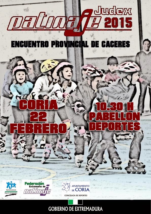 El domingo 22 de febrero, se celebrará en la localidad cauriense el ENCUENTRO PROVINCIAL DE CÁCERES DE PATINAJE JUDEX 2015, organizado por la Federación Extremeña de Patinaje, donde participarán las localidades de: Coria, Puebla de Argeme, Ceclavín y Casas de Don Gómez, reuniendo alrededor de 100 deportistas.