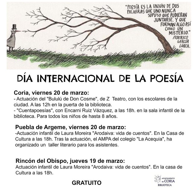 El próximo viernes, 20 de marzo de 2015, celebraremos el DÍA INTERNACIONAL DE LA POESÍA por este motivo el Ayuntamiento ha programado varias actividades en Coria, Puebla de Argeme y Rincón del Obispo.