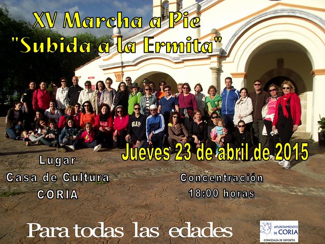 El jueves 23 de abril tendrá lugar la consolidada MARCHA A PIE «SUBIDA A LA ERMITA», que el presente año cuenta con su XV edición. La marcha abierta para todas las edades, se concentrará en la Plaza de la Solidaridad (Casa de Cultura) a las 18:00 horas, partiendo hacia el camino de la Virgen con una distancia aproximada de 10 km. ida y vuelta (2 horas 30 minut.).