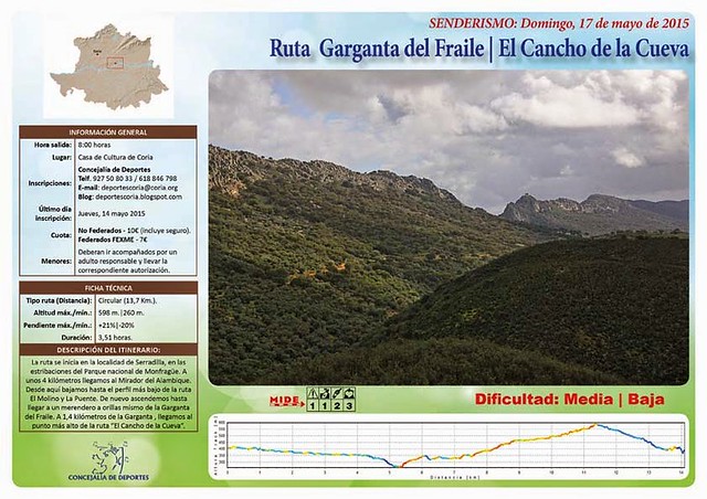 El Departamento de Deportes de la Concejalía de Deportes, da a conocer la ruta senderista del mes de mayo con la ruta «GARGANTA DEL FRAILE / EL CANCHO DE LA CUEVA», una ruta circular con lugar de inicio y llegada en la población de Serradilla (Cáceres).