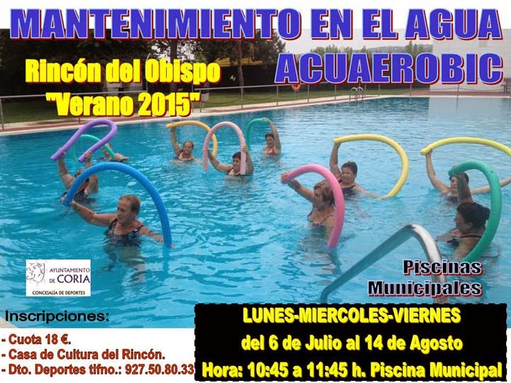 La Concejalía de Deportes del Ayuntamiento de Coria, pone en marcha durante la temporada de verano 2015, los Cursos de Mantenimiento en el Agua y Acuaerobic en las pedanías del Rincón del Obispo y Puebla de Argeme, abriéndose el plazo de inscripción a partir del martes 9 de junio.