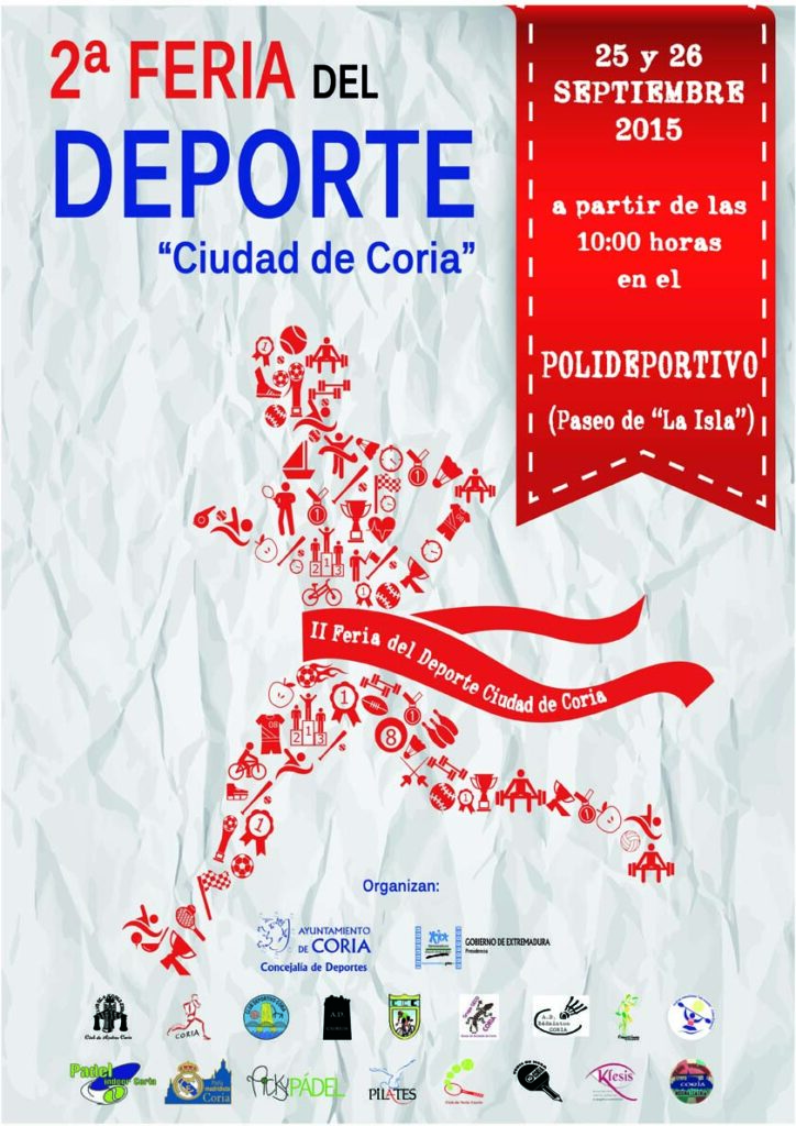 Con motivo del inicio de la nueva temporada deportiva 2015/2016. la Concejalía de Deportes del Ayuntamiento de Coria, tras el éxito de la pasada edición, ha considerado necesario llevar a cabo la celebración de la 2ª FERIA DEL DEPORTE «CIUDAD DE CORIA» en el municipio cauriense durante los días 25 y 26 de SEPTIEMBRE, con la finalidad de dar a conocer y promocionar las diversas actividades, clubes, asociaciones deportivas presentes en el tejido asociativo cauriense. Con esta Feria, se pretende mostrar un escaparate en el que poder observar y practicar las diferentes actividades deportivas que se realizan a lo largo del año en la Ciudad de Coria.