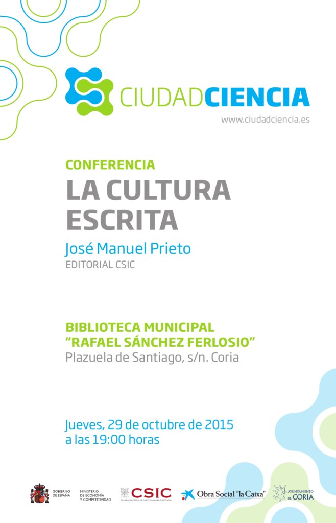 La conferencia tendrá lugar este jueves, 29 de octubre, a las 19:00 horas en la Biblioteca Rafael Sánchez Ferlosio, impartida por José Manuel Prieto de la Editorial CSIC, y se enmarca en el proyecto de divulgación científica Ciudad Ciencia, impulsado por el CSIC y la Obra social «la Caixa» en colaboración con más 30 ayuntamientos.