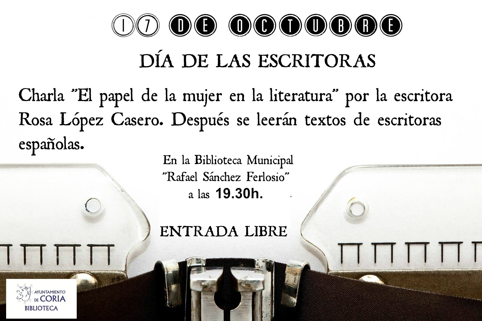 El próximo lunes, 17 de octubre, la Biblioteca Municipal de Coria «Rafael Sánchez Ferlosio» celebra por primera vez (se ha creado esta nueva efeméride) el Día de las Escritoras. La idea de creación fue iniciativa de la Biblioteca Nacional de España (BNE), la Federación Española de Mujeres Directivas (FEDEPE) y la Asociación Clásicas y Modernas para la igualdad de género en la cultura.