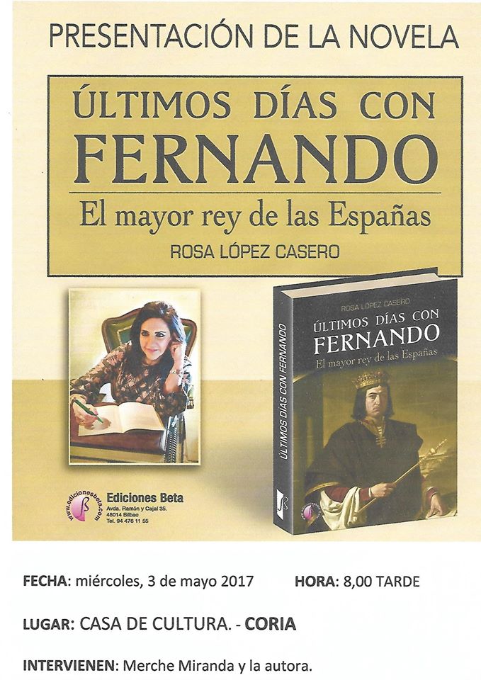 Últimos días con Fernando: El mayor rey de las Españas, la nueva novela de la escritora Rosa López Casero y será presentado en la casa de cultura, esta misma tarde a las 20.00 horas.