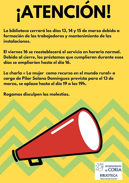 Informamos que la biblioteca permanecerá cerrada los días 13, 14 y 15 de marzo debido a cursos de formación en Cáceres. El viernes 16 se reestablecerá el servicio en horario normal.