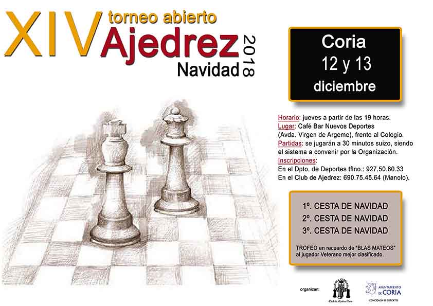 El Club Ajedrez Coria en colaboración con el Ayuntamiento de la ciudad, organiza un año más con motivo de la Navidad, el XIV Torneo de Ajedrez.