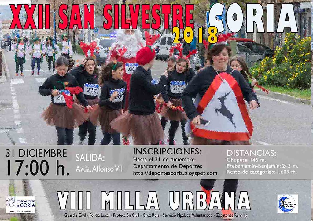 Desde la Concejalía de Deportes del Ayuntamiento de Coria, desean invitarle a toda esta familia deportiva a terminar el año de la mejor forma posible, practicando deporte, con la participación en la XXII San Silvestre y 8ª Milla Urbana Coria 2018, que la presente edición se celebrará el lunes 31 de diciembre a partir de las 17:00 horas, siendo la salida y meta en la Avda. Alfonso VII.