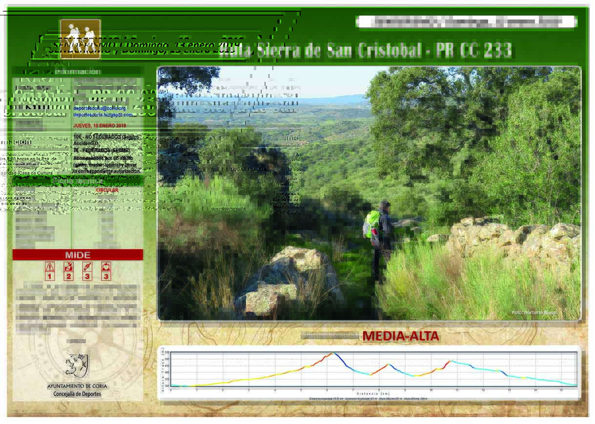 El Departamento de Deportes del Ayuntamiento de Coria, con la puesta en marcha de la nueva temporada senderista 2019, da a conocer la ruta del mes de ENERO denominada «SIERRA DE SAN CRISTOBAL-PRCC 233», una ruta circular con lugar de inicio y llegada en la población de Almoharín, en la provincia de Cáceres, y una duración aproximada de 3,53 horas.