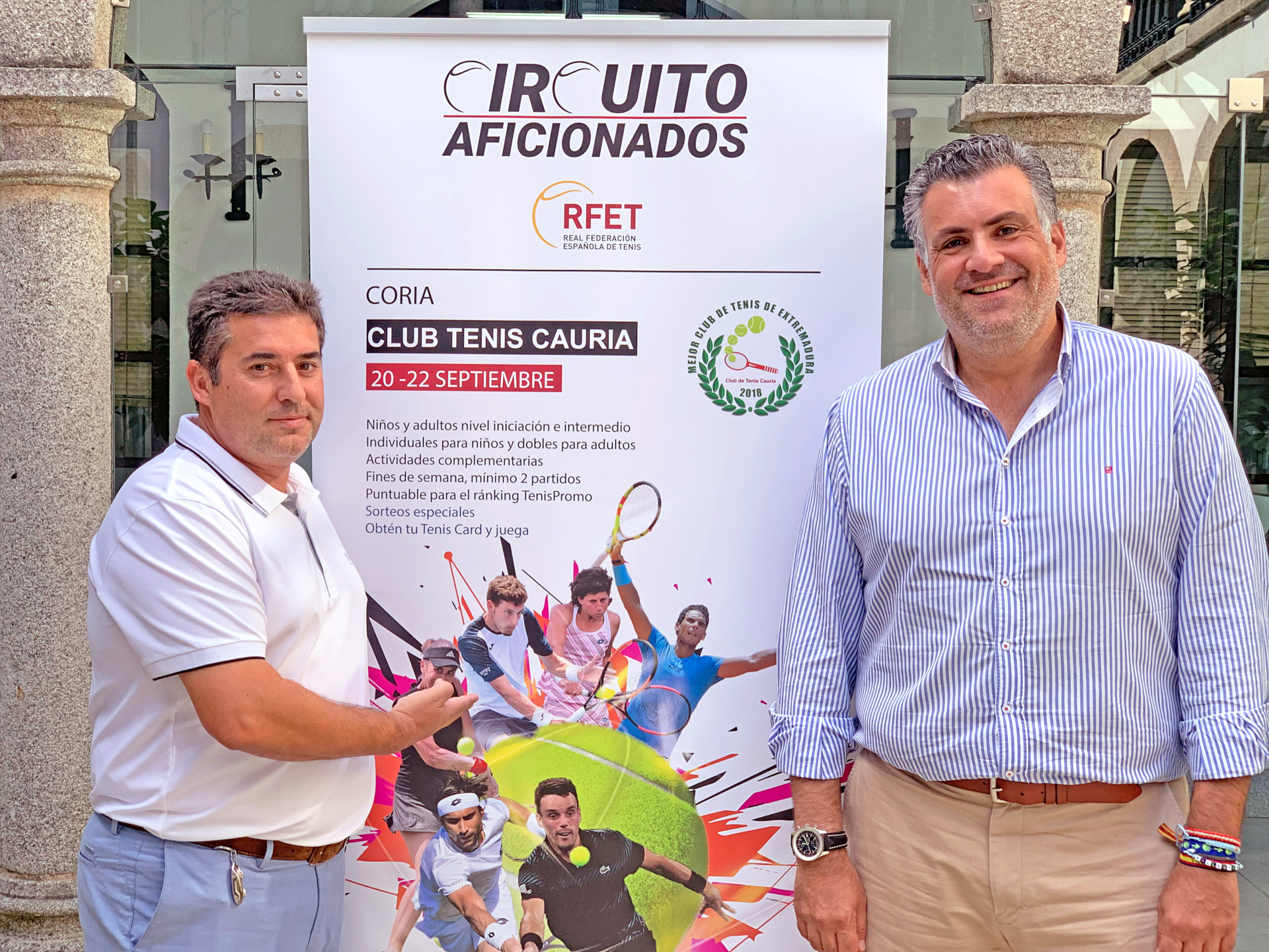 El Alcalde de Coria, José Manuel García Ballestero, acompañado del Presidente del Club de Tenis Cauria, Roberto Jiménez Navarro, han presentado esta mañana esta prueba deportiva diseñada por la RFET, a través de un circuito de torneos de tenis dirigidos a jugadores aficionados de todas las edades, sexos y niveles, tanto de iniciación como intermedio, a disputarse a nivel nacional dentro de las distintas CC.AA. de España, tras la excelente acogida que tuvo el mismo en la edición pasada en todo el país.