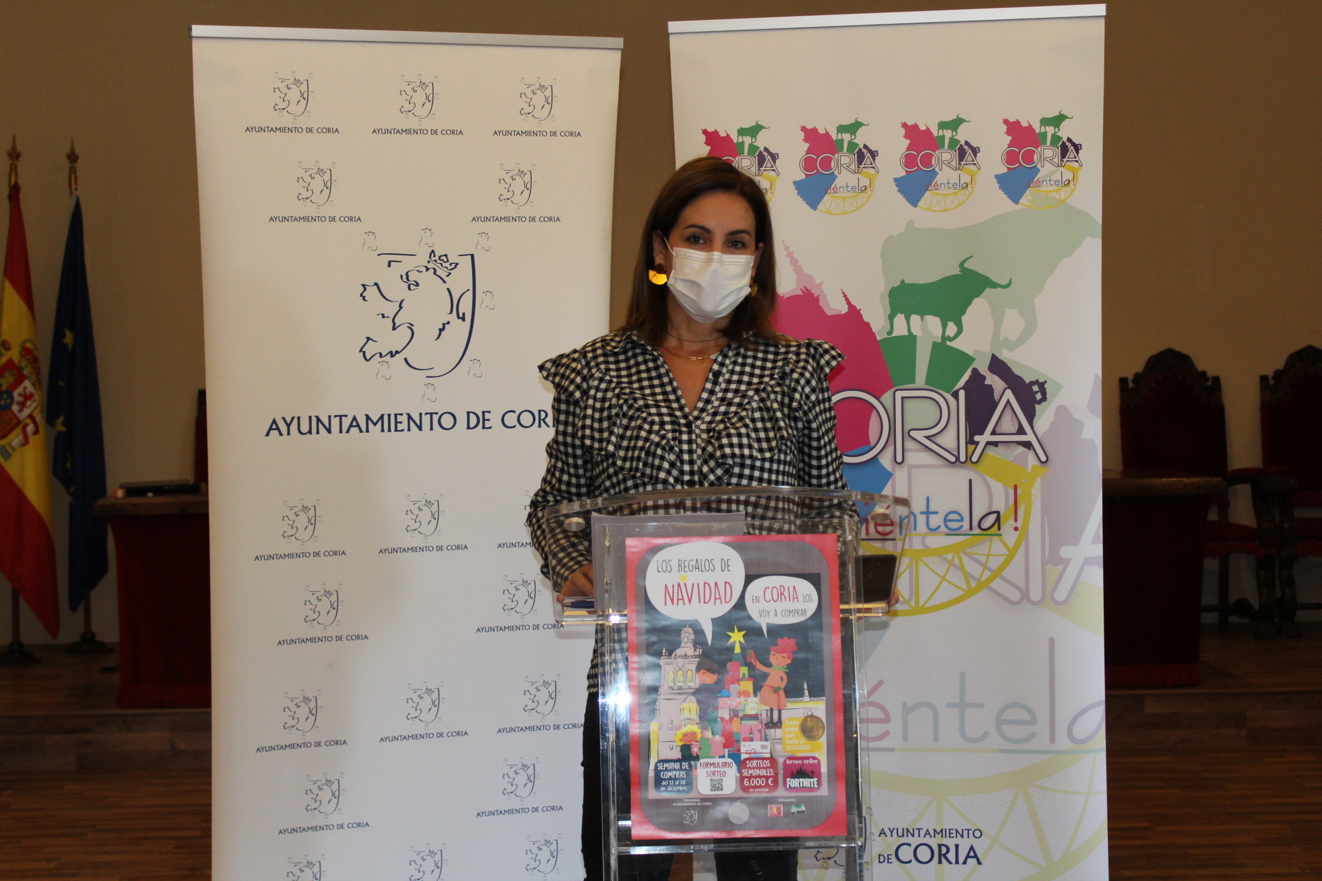 Esta mañana en el salón de plenos del Ayuntamiento, la Concejal de Desarrollo Local y Comercio, Almudena Domingo Pirrongelli, ha presentado la Campaña del Comercio que este año lleva como lema «Los regalos de Navidad, en Coria los voy a comprar».