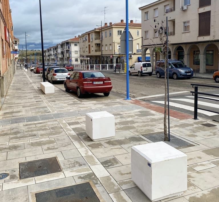 Los acerados son más amplios, con un ancho mayor a 4 metros, ampliándolos en los cruces para mejorar la visibilidad del peatón al cruzar. De los más de cuatro metros de ancho de los acerados se ha continuado en el día de hoy con la colocación del mobiliario urbano que faltaba por colocar, los bancos.