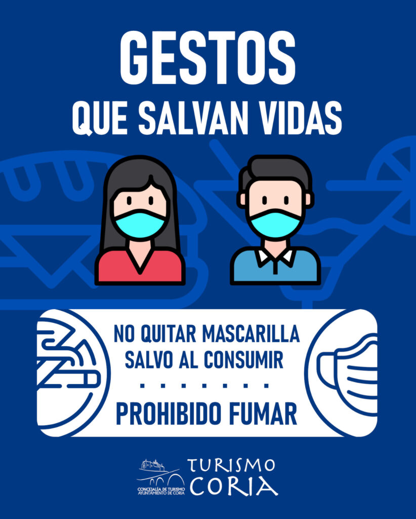 El Ayuntamiento de Coria, a través de la Concejalía de Turismo, ha puesto en marcha una campaña para sensibilizar a los ciudadanos de la importancia del uso de la mascarilla en todos aquellos espacios públicos, abiertos o cerrados, especialmente en los establecimientos hosteleros de la localidad para la prevención de contagio del Covid-19