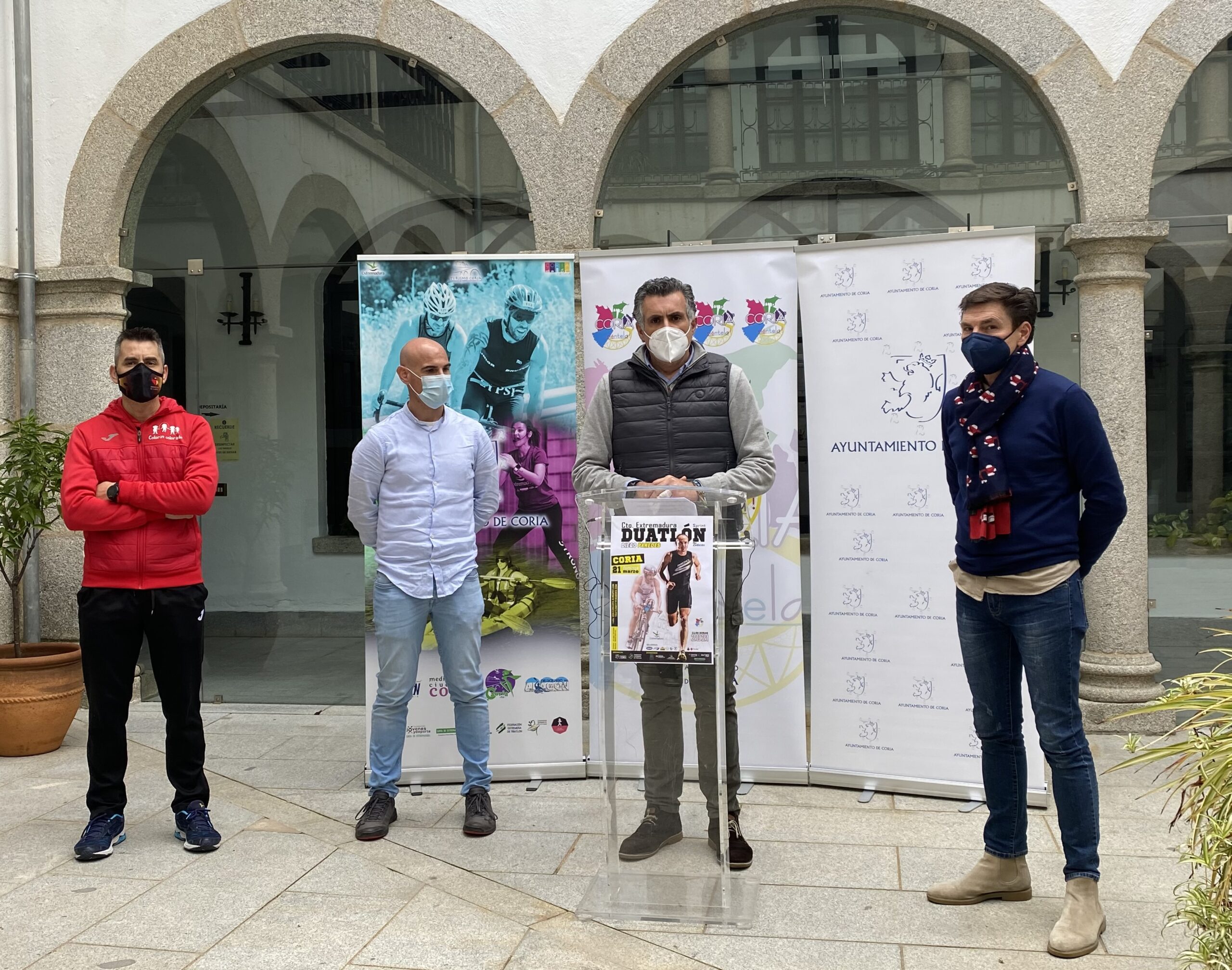 La prueba ha sido presentada en la mañana de este miércoles en el patio de cristal del Ayuntamiento, de la mano del Alcalde de la Ciudad, José Manuel García Ballestero y el Presidente de la Federación Extremeña de Triatlón, José Manuel Tovar, quienes han estado acompañados por el Concejal de Deportes, Juan Manuel Gutiérrez Rodríguez y el Presidente del Club de Triatlón Coria, Juan José Sánchez.