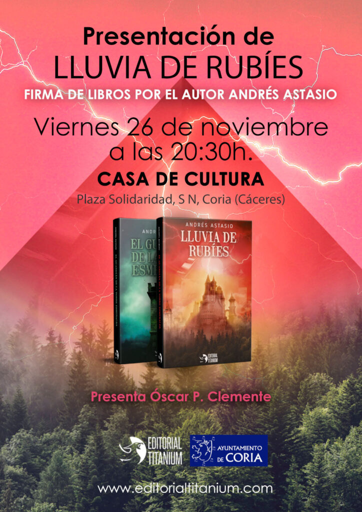 El escritor cauriense Andrés Astasio presentará mañana viernes, a las ocho y media de la tarde, en la Casa de Cultura de nuestro municipio, su nueva obra titulada «Lluvia de rubíes» de la editorial Titanium.