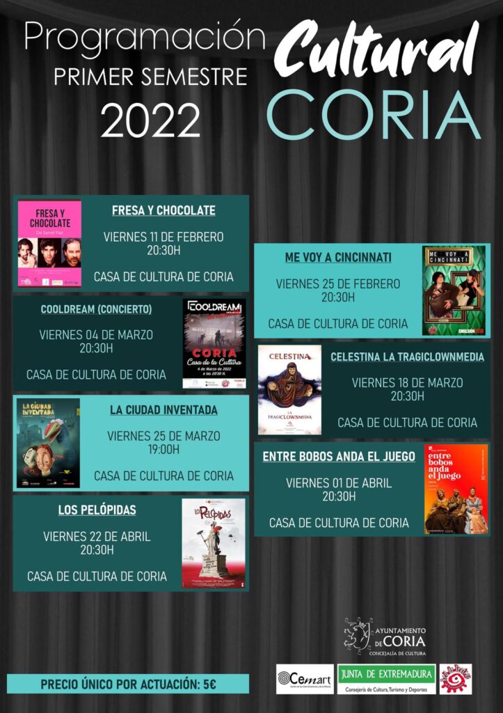 El Ayuntamiento de Coria, en colaboración con la Concejalía de Cultura, pone en marcha un primer semestre de 2022 lleno de actividades culturales, y que tendrán lugar en la Casa de Cultura de nuestra localidad.