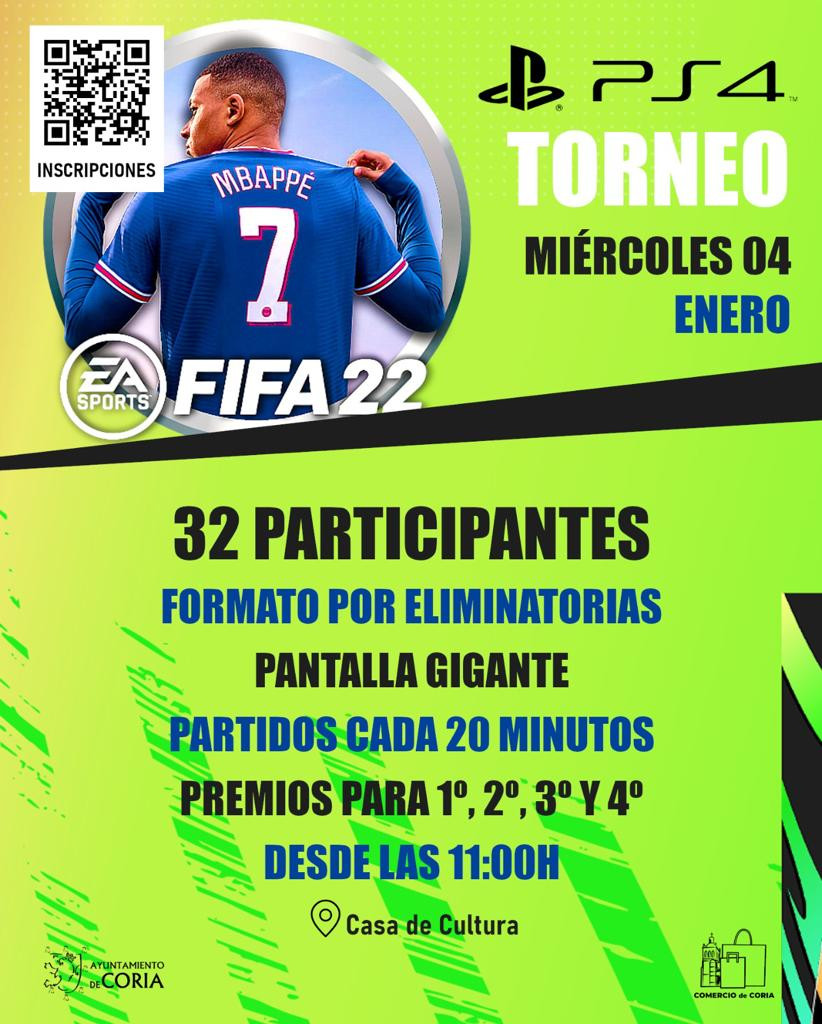 El torneo de FIFA se celebrará en la casa de cultura el día 4 de enero a partir de las 11h. En dicho torneo de FIFA solo podrán participar un total de 32 jugadores. Las inscripciones las podrán realizar las personas mayores de 3 años, de forma gratuita a través de un formulario de inscripción que se publicará en https://forms.gle/FPLXPasesY78m7sw7.