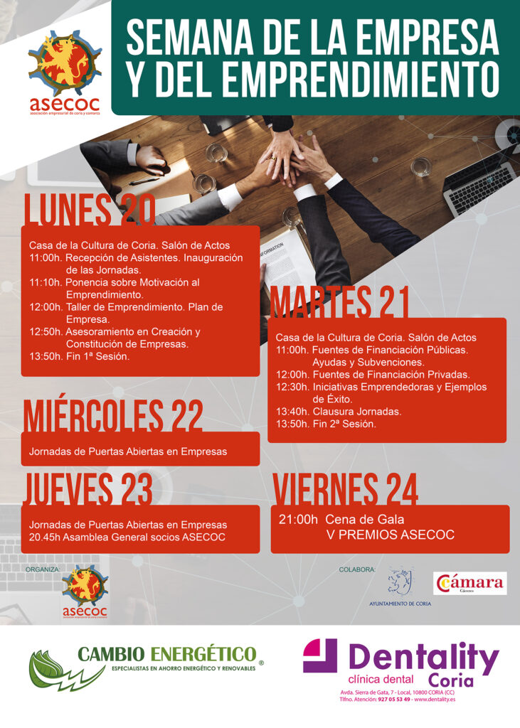 La Asociación Empresarial de Coria y Comarca (ASECOC) organiza la denominada “SEMANA DE LA EMPRESA Y DEL EMPRENDIMIENTO”, en la que, con el apoyo de las empresas asociadas Cambio Energético y Dentality Coria y la colaboración del Ayuntamiento de Coria y la Cámara de Comercio de Cáceres, tendrá lugar durante la semana del 20 al 24 de marzo.