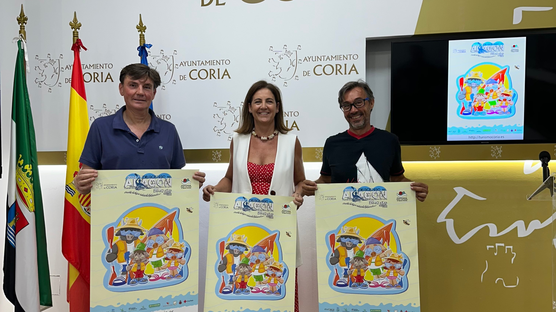 La Alcaldesa de Coria, Almudena Domingo Pirrongelli, junto al Concejal de Deportes, Juan Manuel Gutiérrez Rodríguez y el gerente de la empresa Panthos, Deporte y Ocio inclusivo en espacios naturales, David Pérez Chaparro, han presentado esta mañana las novedades de la XV edición del Descenso del Río Alagón “Puente de la Macarrona-Puente de Hierro de Coria”.