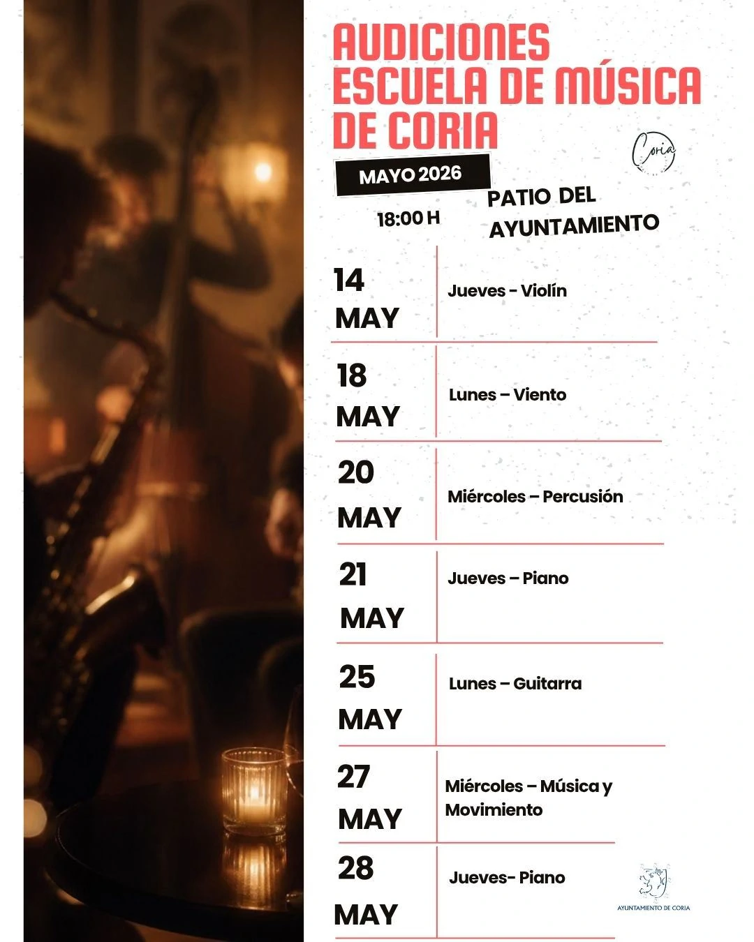 Las Audiciones de Mayo de la Escuela Municipal de Música de Coria tendrán lugar en el Patio de Cristal del Ayuntamiento de Coria a las 18 horas del 14 al 28 de mayo de 2026.