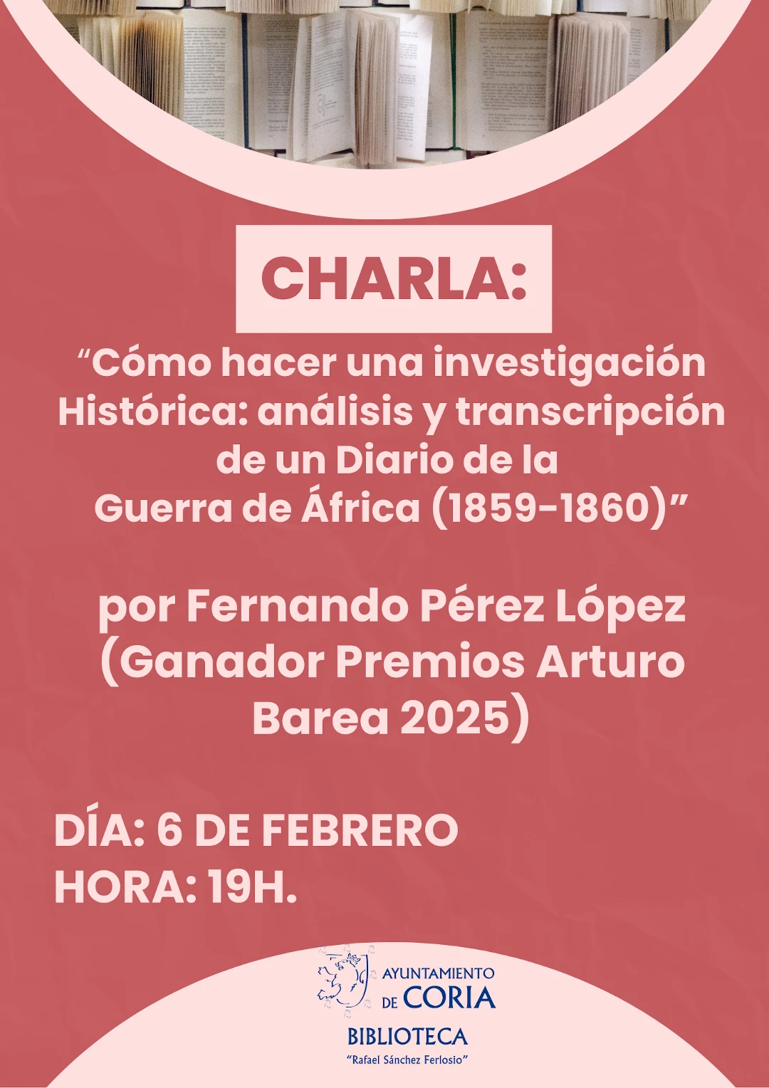 El próximo viernes, 6 de febrero, nos visitará Fernando Pérez López, ganador del Premio Arturo Barea de Investigación Cultural 2025, organizado por la Diputación de Badajoz, por su obra «Un soldado español en la Guerra de África, 1859-1860». Este galardón reconoce estudios profundos sobre la historia cultural de la región, destacando en esta edición el análisis de la primera guerra africana.