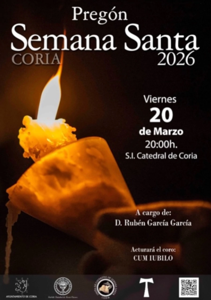 La ciudad de Coria celebrará este viernes, 20 de marzo, el tradicional Pregón que marca el inicio oficial de la Semana Santa Cauriense. El acto tendrá lugar a las 20:00 horas en la Catedral de Coria y estará a cargo de Rubén García, quien será el encargado de anunciar y exaltar una de las celebraciones más arraigadas y representativas de la ciudad.