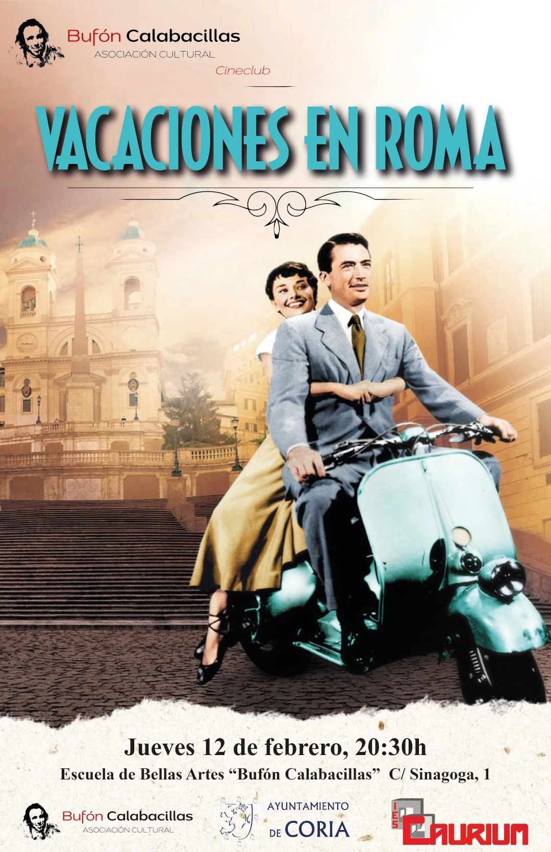 El día 12 de febrero de 2026, la Asociación Bufón Calabacillas continua su cine club con la proyección de una película «Vacaciones en Roma », será a las 20h30 en el la sede de la asociación Calle Sinagoga de Coria.