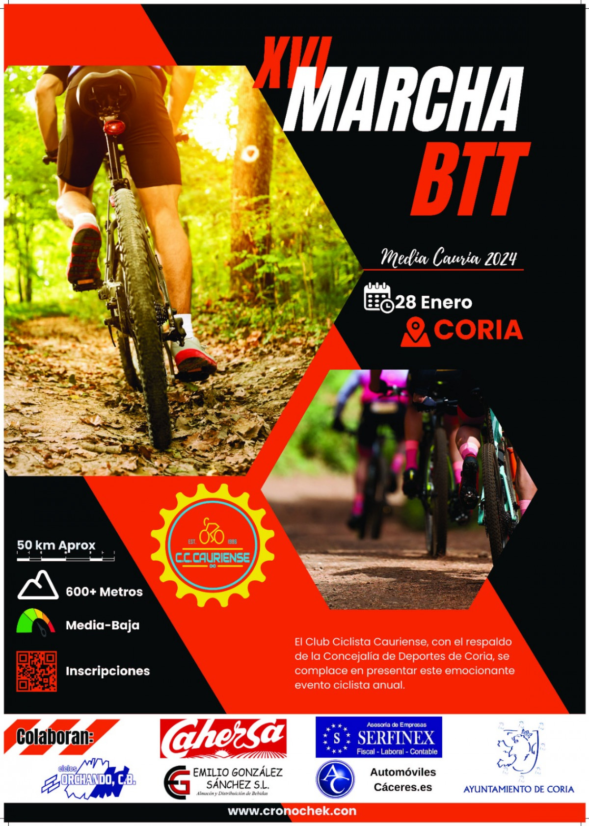 El Club Ciclista Cauriense, junto con la colaboración del Ayuntamiento de Coria, presenta la XVI MARCHA DE BTT “MEDIA CAURIA”, que en la presente edición 2024 tendrán lugar el DOMINGO 28 DE ENERO, siendo la hora de salida de la BTT a las 09:30 horas desde el Paseo de la Isla. La entrega de dorsales empezará a las 08:00 horas en Restaurante Montesol, a pocos metros de la salida.
