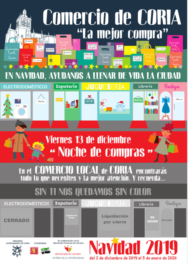 El Ayuntamiento de Coria y el Comercio Local, invitan a todos a participar en esta Campaña de Navidad y a colaborar con nuestro comercio, el de nuestra Ciudad. El viernes, día 13 de diciembre, hasta las 24.00 horas el Comercio Local estará abierto con muchos descuentos y promociones con el objeto de hacer más llevadero los gastos de estas fechas.