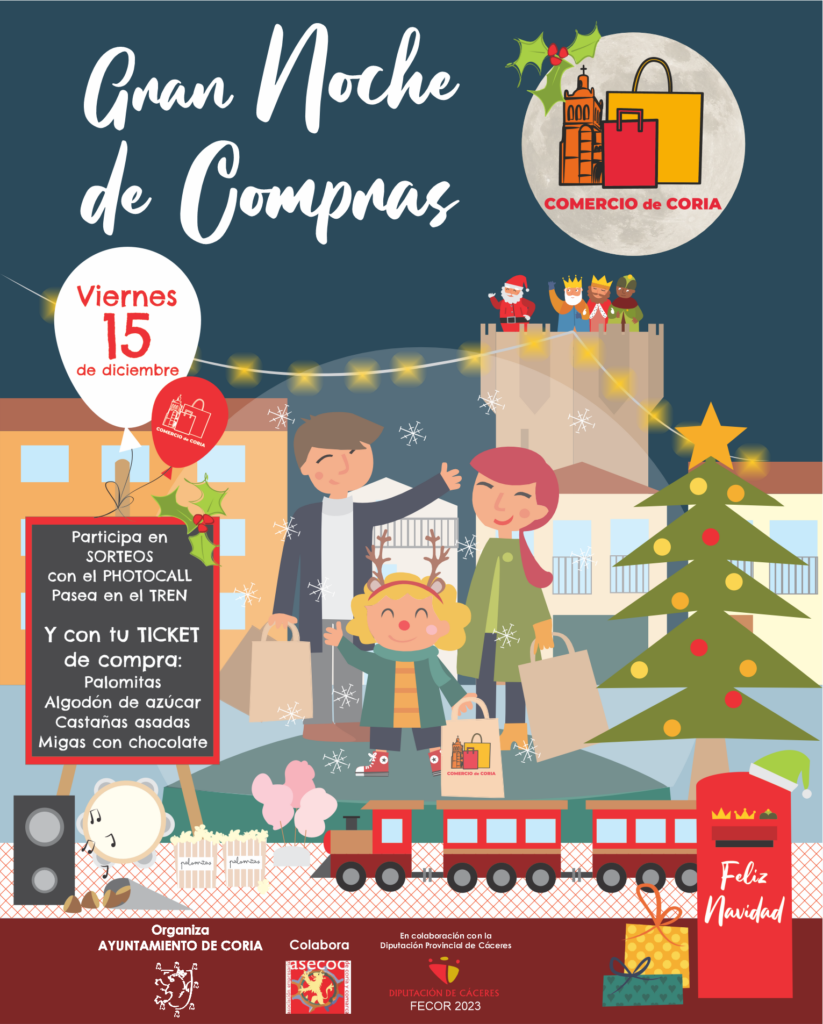 El Ayuntamiento de Coria, a través del departamento de Comercio y Desarrollo Local, organiza un año más la noche más esperada del año. La Noche de Compras, un evento más que consolidado en la ciudad, en el cual los comercios participantes abrirán sus puertas desde las 19h hasta las 00:00 horas.
