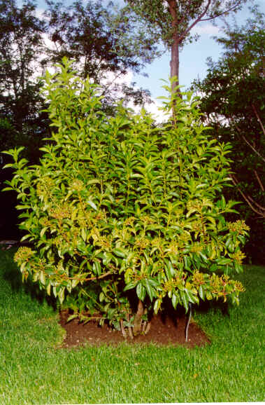 Es un arbusto muy ramoso, que se mantiene verde todo el año y suele acanzar 3 ó 4 metros de altura. Ramillas algo angulosas, frecuentemente de color rojizo.Tiene un follaje muy denso.